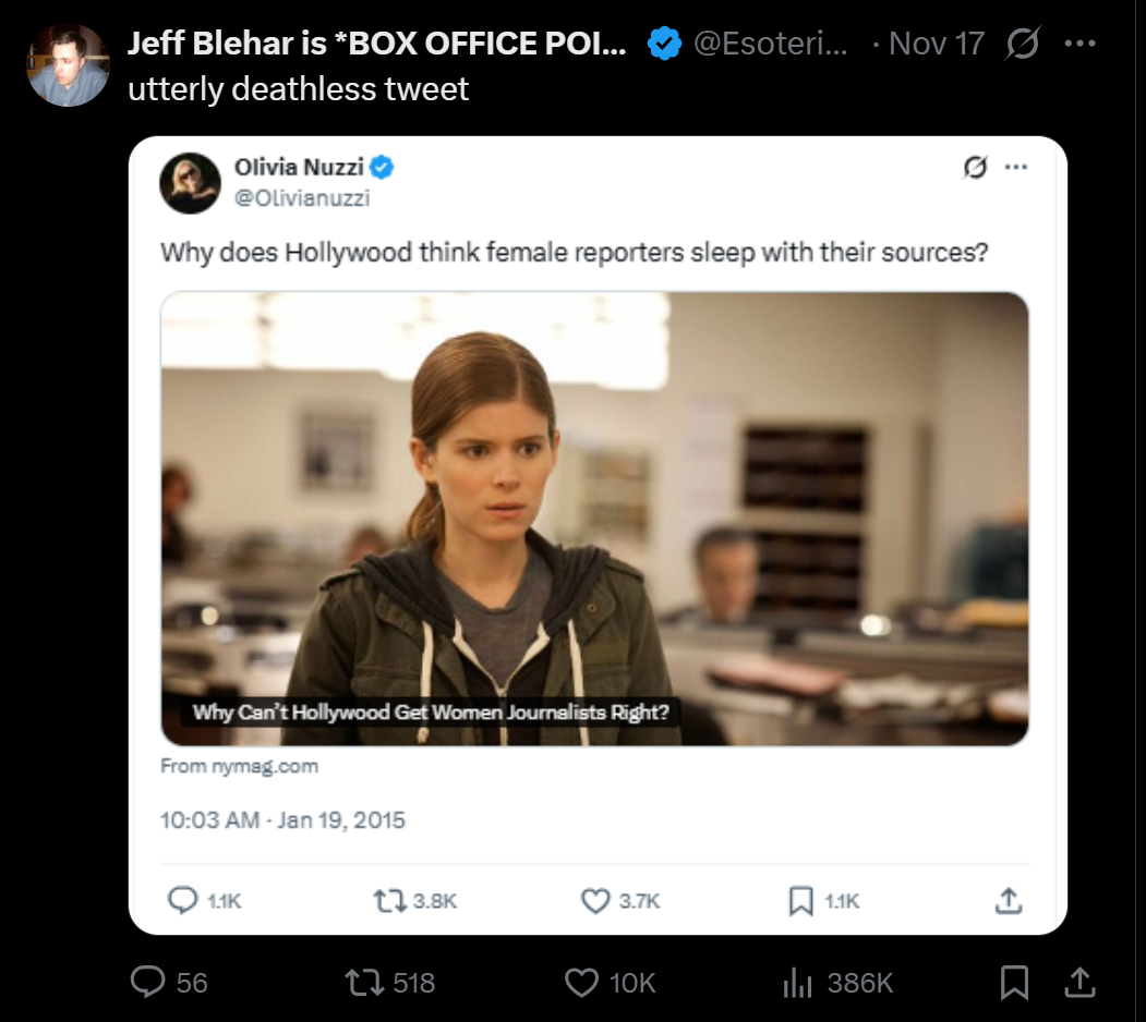 My favorite part goes back to an old tweet from Olivia about the Zoe Barnes character (played by Kate Mara) in “House of Cards.” Olivia self-righteously asks, “Why does Hollywood think female reporters sleep with their sources?” Now we’ll save that deeper conversation for another time (men and women both use sex to get ahead), but the hypocrisy here is hilarious! As we’ll see, Olivia doesn’t seem to be shy about falling in love with and/or sleeping with sources and others in her industry. Maybe she loves sex. That’s great! But don’t get on your high horse and then casually toss aside any journalistic ethics you pretend to have.